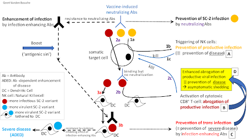 Bei Geimpften, die vor der C-19-Impfung nur wenig Erfahrung in der Bekämpfung produktiver Infektionen (und damit ein schlechtes Training ihrer angeborenen Immunabwehr) hatten (vgl. A: 1a-1b-1c), werden infektionsfördernde Abs[16] (vgl. A: 1a-1b-1c) gebildet. C: ), die für die Verhinderung einer schweren Erkrankung durch Bindung an DC-gebundene Viren verantwortlich sind (gemäß 3a-3b), können mit der kontinuierlich aktivierten zytotoxischen CD8+ Tc-vermittelten Abtötung (vgl. B) synergieren, um eine Erkrankung sogar ganz zu verhindern und somit die Geimpften trotz ihrer hohen Anfälligkeit für eine erneute Infektion asymptomatisch zu machen (vgl. D). Da die Verhinderung einer Erkrankung nicht auf die Verhinderung einer produktiven Infektion, sondern auf eine beschleunigte Beseitigung der Infektion zurückzuführen ist, werden diese Geimpften bei einer erneuten Infektion weiterhin SC-2 ausscheiden und übertragen. Während die Effektorzellen des angeborenen Immunsystems MHC-unbeschränkt und polyspezifisch sind (z. B. NK-Zellen) und daher keine Immunflucht fördern, sind die infektionsfördernden Antikörper Ag-spezifisch (d. h. S-spezifisch) und werden – wenn sie von einem großen Teil der Population in hohen Titern produziert werden – die natürliche Selektion von Varianten der Immunflucht fördern, die der virulenzhemmenden Kapazität dieser Antikörper widerstehen können. Der Grund dafür ist, dass die Geimpften eine produktive virale Infektion nicht verhindern können; folglich ist der Immundruck, den sie auf die virale Virulenz ausüben, insofern suboptimal, als er die dominante Ausbreitung von SC-2-Varianten, die diesen Immundruck überwinden können, nicht verhindern kann. Die Resistenz viraler Varianten gegen die virulenzhemmende Wirkung von infektionsfördernden Abs führt unweigerlich zu ADEI-vermittelter ADED.