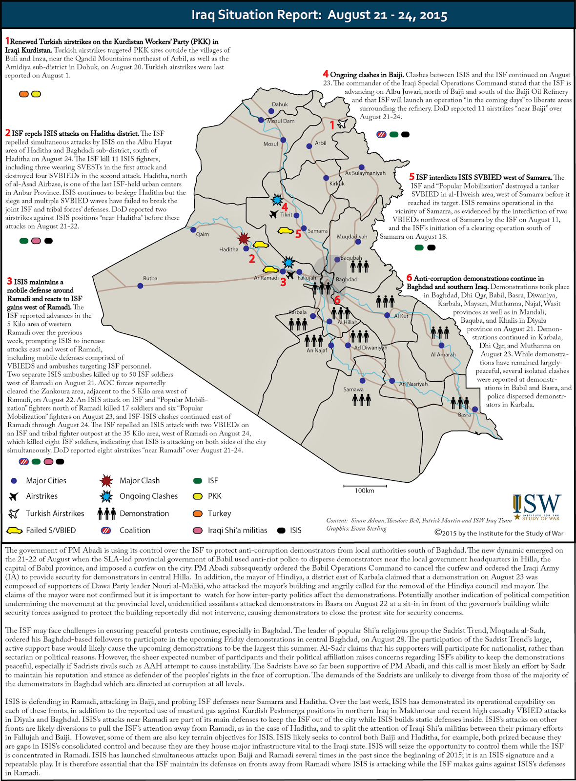 Seit der Rückeroberung von Tikrit, das noch immer weitgehend leer ist, hat sich trotz der militärischen Interventionen der US-geführten Koalition wenig verändert. Falludscha oder Ramadi werden noch vom IS kontrolliert, auch die Stadt Beiji ist weiter umkämpft, die Ölraffinerie im Norden wird vom IS gehalten. Am Verkauf des Öls soll der IS hier allein monatlich eine Million US-Dollar erzielen. Erfolge gibt es vor allem dort, wo kurdische Peschmerga- und PKK-Kämpfer auf dem Boden den IS zurückdrängen konnten. Dabei spielen die Luftangriffe sicher eine Rolle, aber nach einem Jahr der Luftkampagne bleiben die Erfolge bescheiden (Es werden noch mehr Flüchtlinge vor dem Winter kommen).