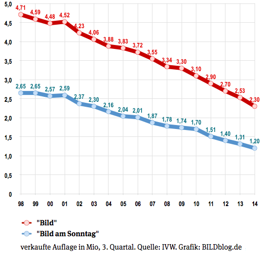 BILD aus dem Hause Springer hat immer weniger Leser in den Printausgaben "BILD" und "BILD am Sonntag" und säuft regelrecht ab.